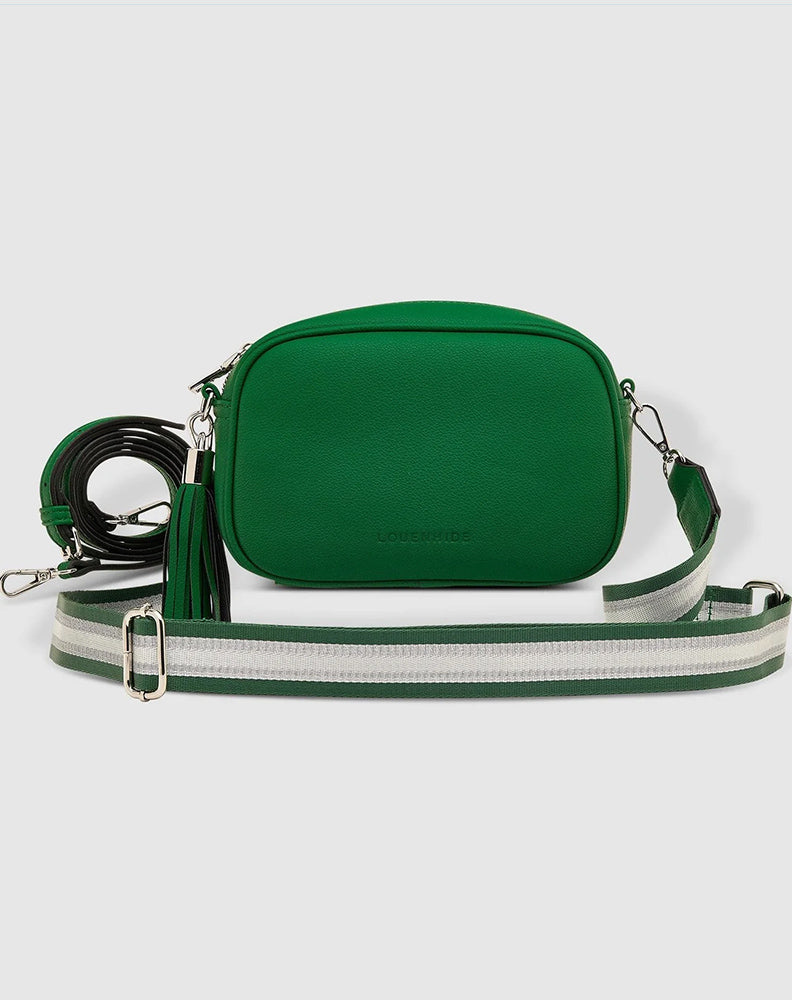 The Louenhide Jacinta Green Crossbody Bag is the ultimate cool-girl bag, featuring a complimentary detachable metallic guitar strap. Feel luxe and sporty with our Jacinta over your shoulder. Walk out in style with a fun tassel feature and secure your essentials with its slip and zip pockets. Designed to style effortlessly with your daily wardrobe.