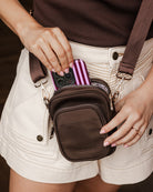 The Lyla Chocolate Phone Bag is your ultimate companion for carefree summer adventures- lightweight, functional, and effortlessly elevated. Designed for days when you just need the essentials, this phone crossbody bag is compact yet surprisingly spacious, with three thoughtfully arranged compartments - two of which are secured with zips for added peace of mind. Crafted from durable nylon and finished with light gold hardware, Lyla Chocolate features an adjustable and detachable sateen strap that allows you to wear her your way. Whether you're exploring a new city or heading out for a golden hour spritz, this small crossbody for summer travels keeps your phone, cards, and keys close without weighing you down.