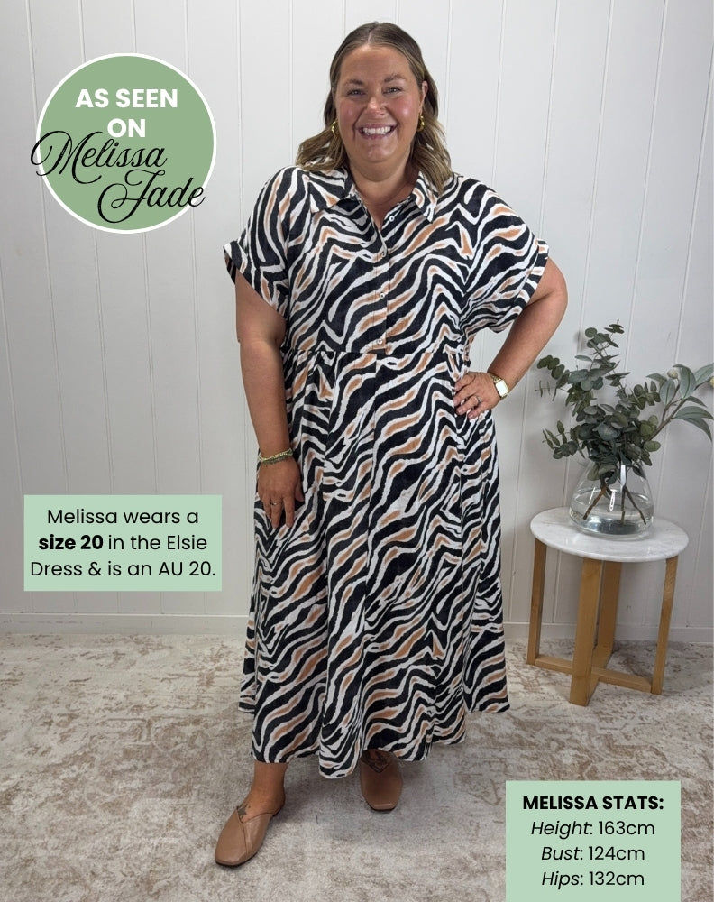 Lizzie wears a size XL. She is an AU 14-16. Her height is 167cm, bust is 102cm, waist is 76cm and hips are 106cm.