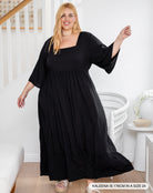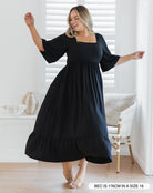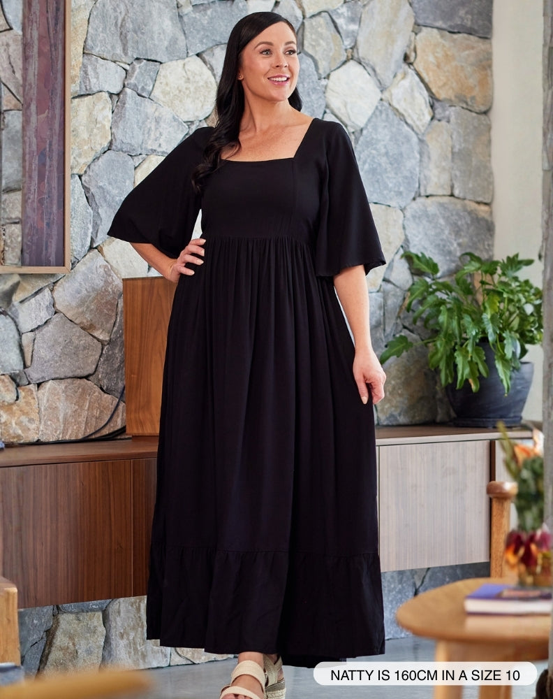 Our Kalani Dress is a show stopper! The cut, the fabric, the maxi length ... it is stunning. A flattering square cut neckline is complimented by a flowing sleeve, feminine empire seam and maxi skirt. Style with a sandal for day or elevate for evening with a heel.