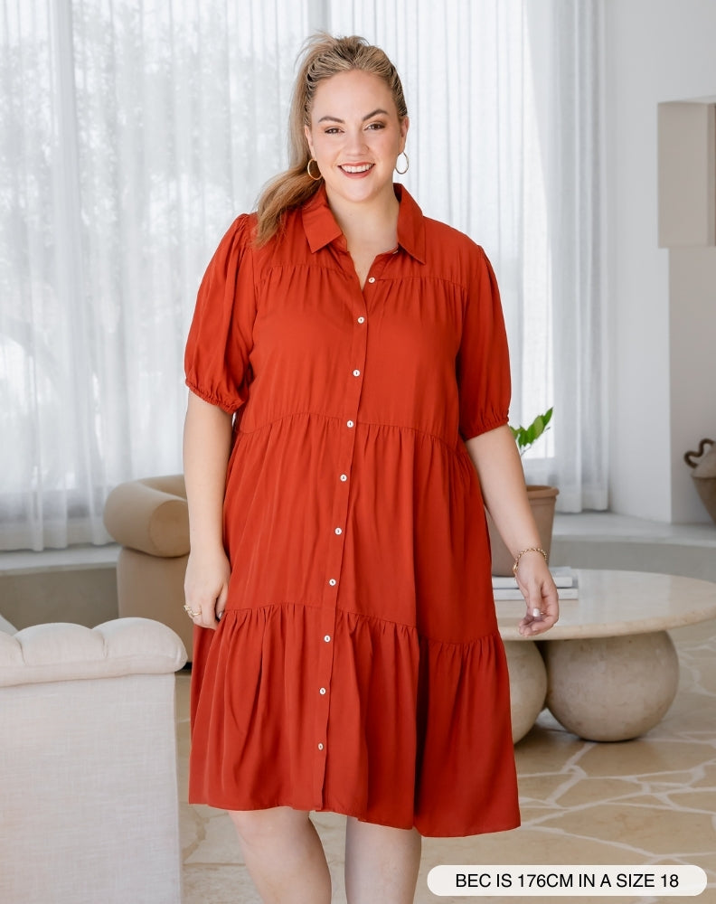Bec wears a size 18 and is an AU 18. Her height us 176cm, bust is 106cm, hips is 120cm.