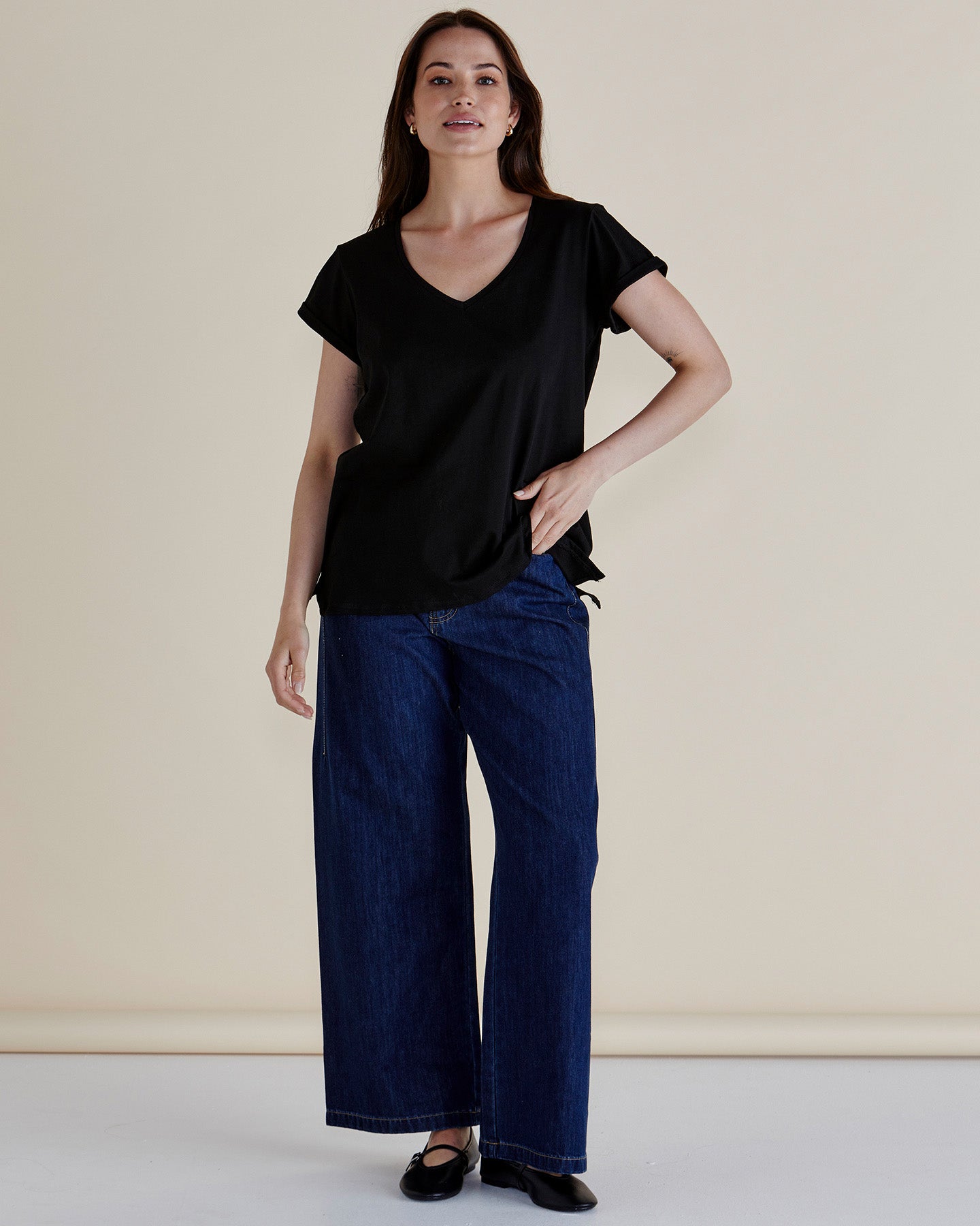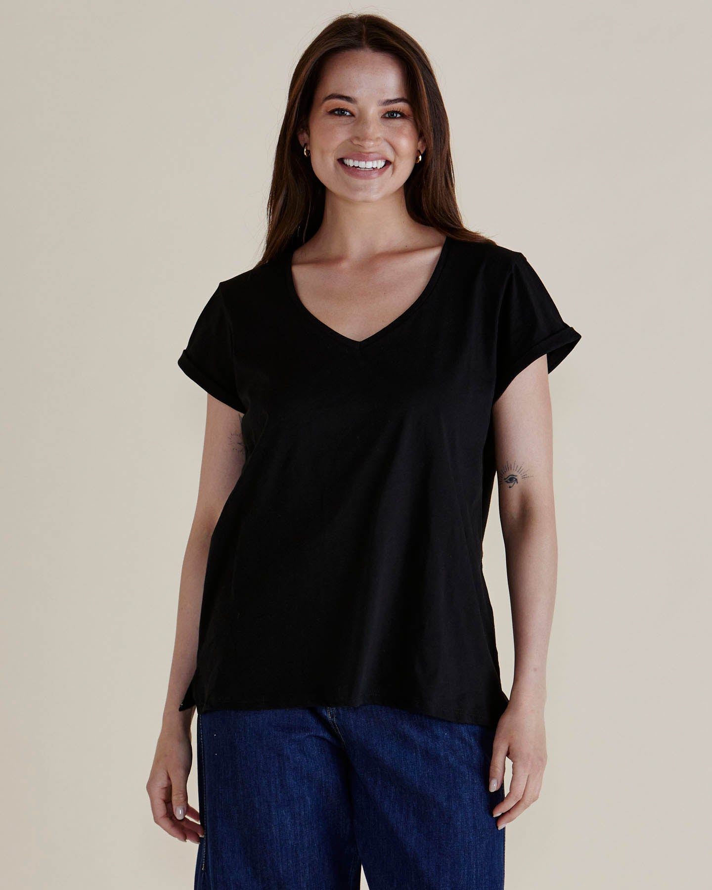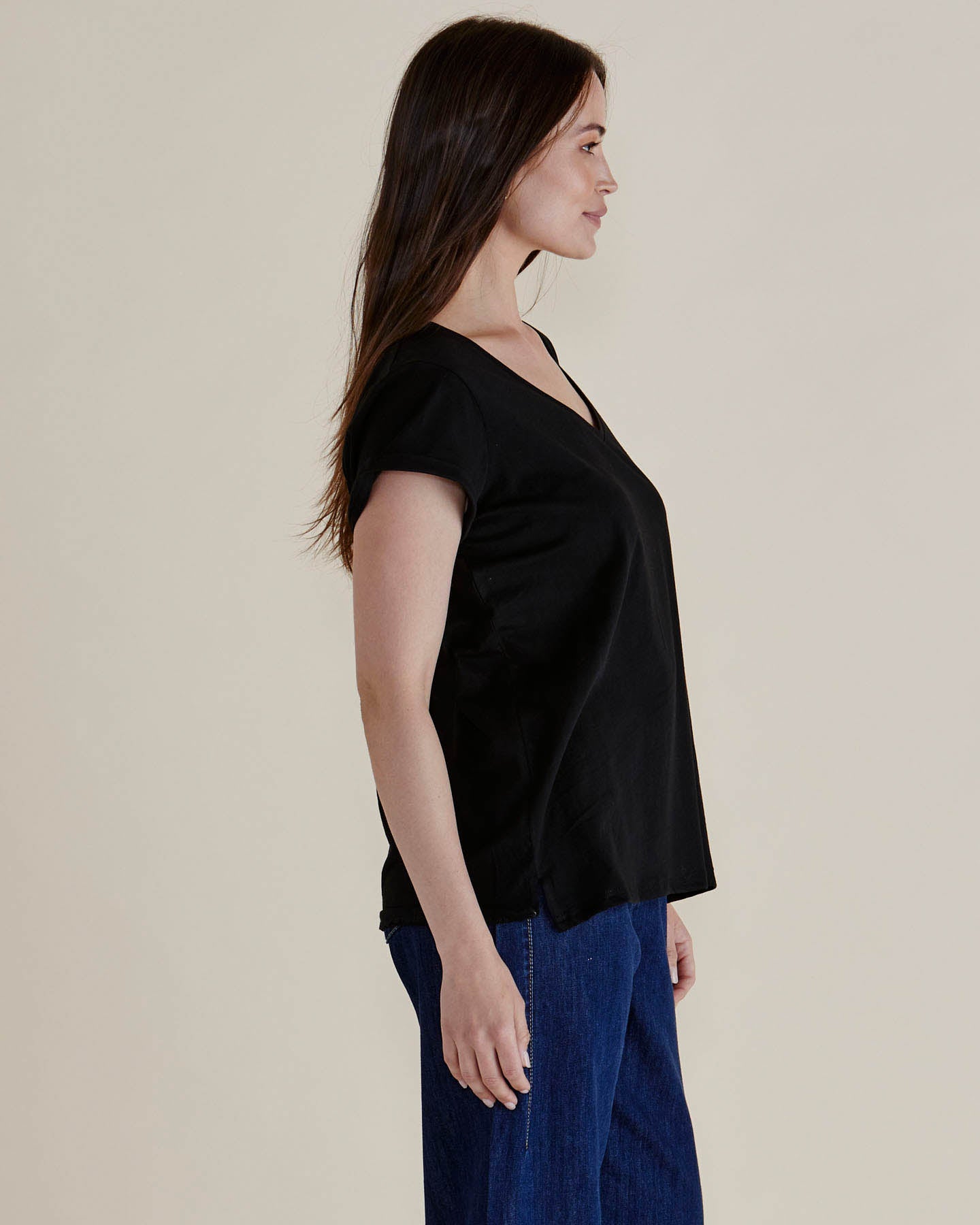 With its understated elegance, the Ayla V-Neck Tee is a must-have staple. The V-neckline and side split detailing add polish, while the slight high-low hem creates an effortlessly flattering silhouette. Crafted from soft cotton jersey, this relaxed fit tee is both timeless and transeasonal. Ideal for layering or wearing solo.