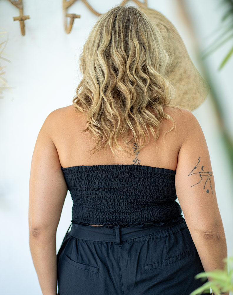 Our new shirred Bandeau top is a wardrobe must! Not only does it look amazing as a standalone top styled this summer with shorts, skirts and beach pants. This Bandeau looks amazing under our famous Freez Rayon Overalls, Apron Dresses and Pinafore. A great piece to wear under any slightly sheer tops too!
