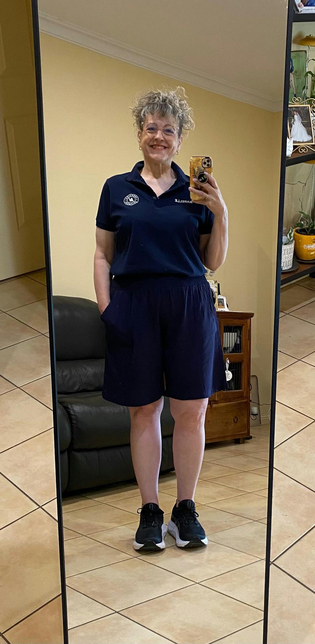 Lisa is wears a size S. She is an AU 10-12. Her height is 160cm, bust is 90cm, hips are 99cm and waist is 90cm.