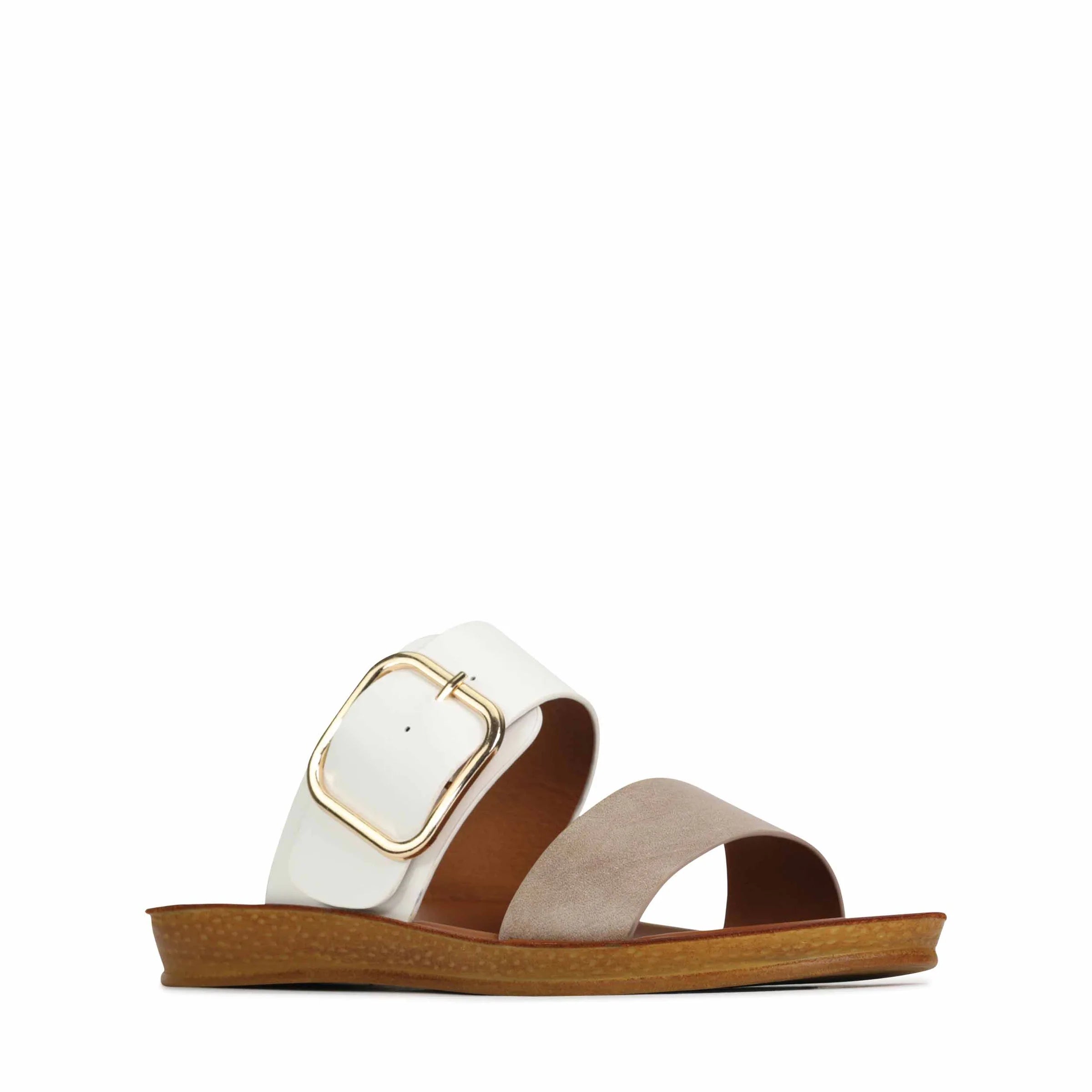 - A comfortable, easy-to-wear slide with two supportive straps over the foot.