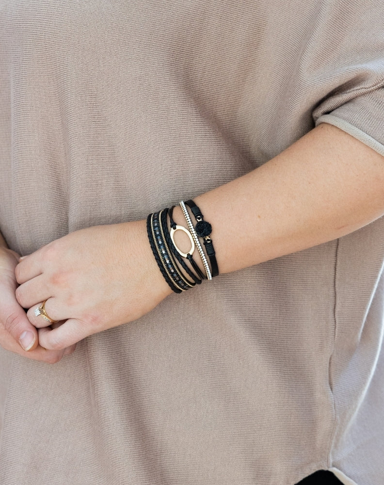 Wrap like bracelet with clasp that creates the illusion of a fashionable bracelet stack.