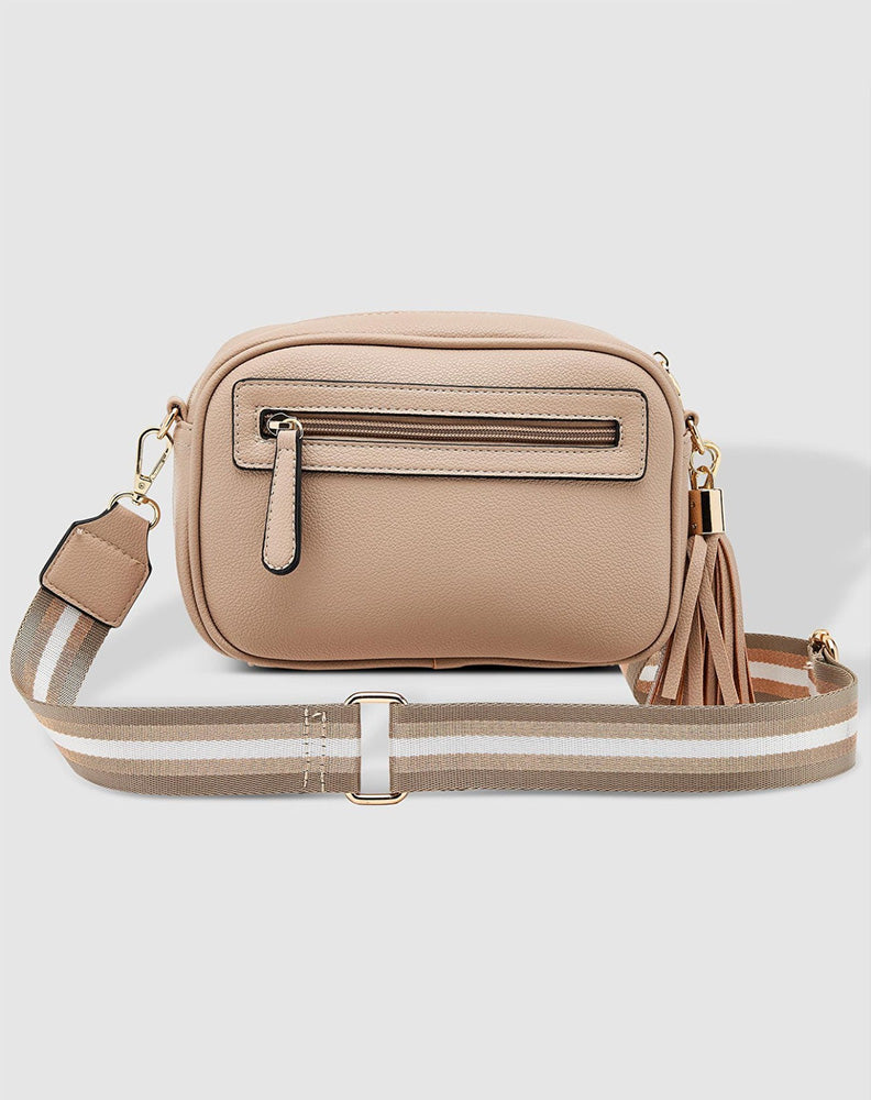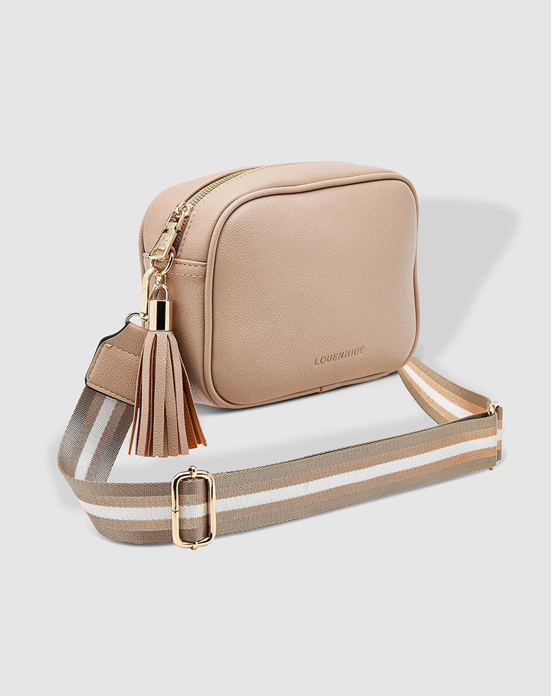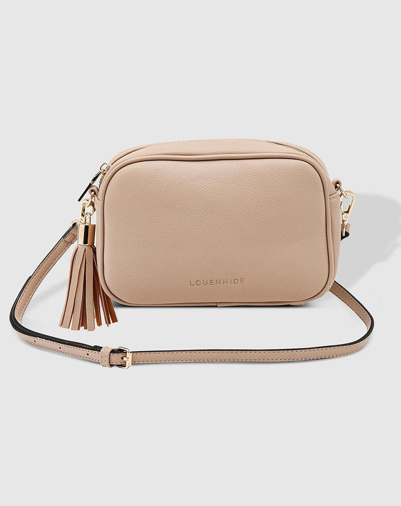 The Louenhide Jacinta Stone Crossbody Bag is the ultimate cool-girl bag, featuring a complimentary detachable metallic guitar strap. Feel luxe and sporty with our Jacinta over your shoulder. Walk out in style with a fun tassel feature and secure your essentials with its slip and zip pockets. Designed to style effortlessly with your daily wardrobe.