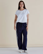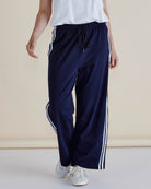 These wide-leg joggers in cotton jersey blend offer a refined approach to casualwear with elasticated waistband and contrast trim detailing. The mid-high rise and relaxed fit create a polished yet comfortable silhouette ideal for transeasonal layering.