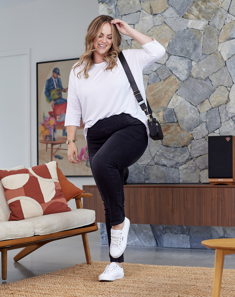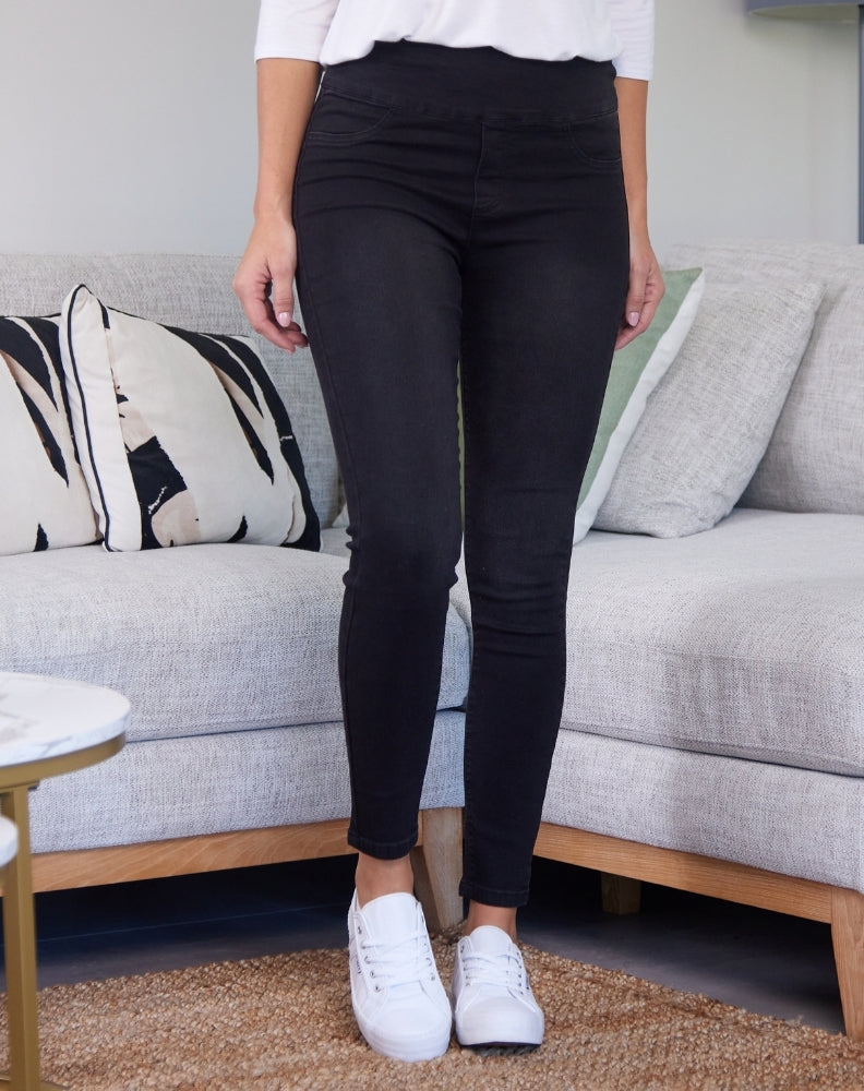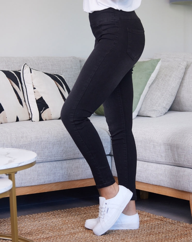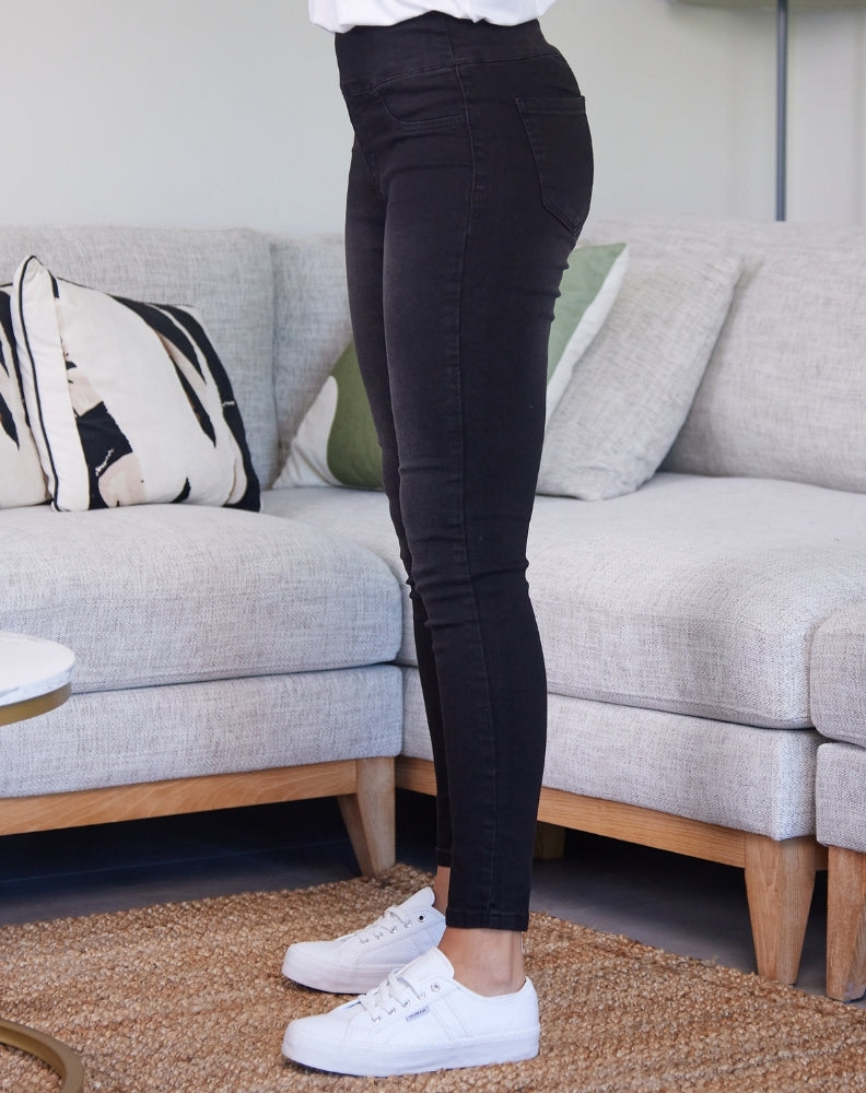 Pull On Jeans are all about comfort and quickly will become your new go-to jeans! A skinny leg fit with stretch, these jeans also have a banded elasticised waist. The black wash is timeless and easy to style for both day & night.