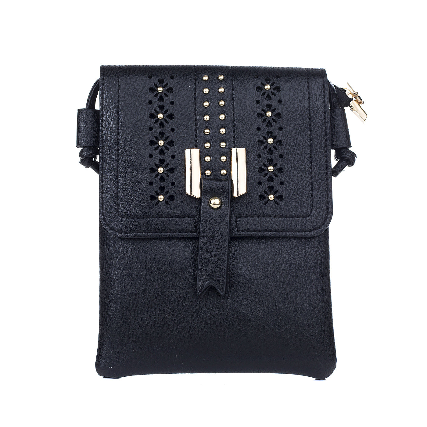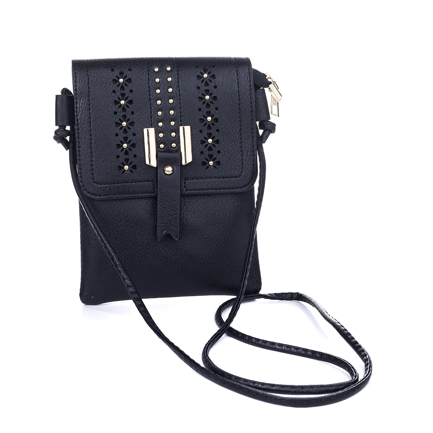 Freez Sling Bag in BLACK. A sling style bag is a must-have for every wardrobe! Incredibly versatile this bag is perfect for day, evening out or anytime you need to carry essentials and be hands free. A laser cut and stud design on the front is complimented by buckle hardware.