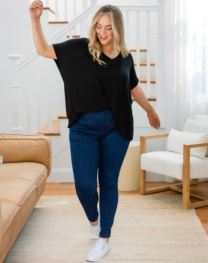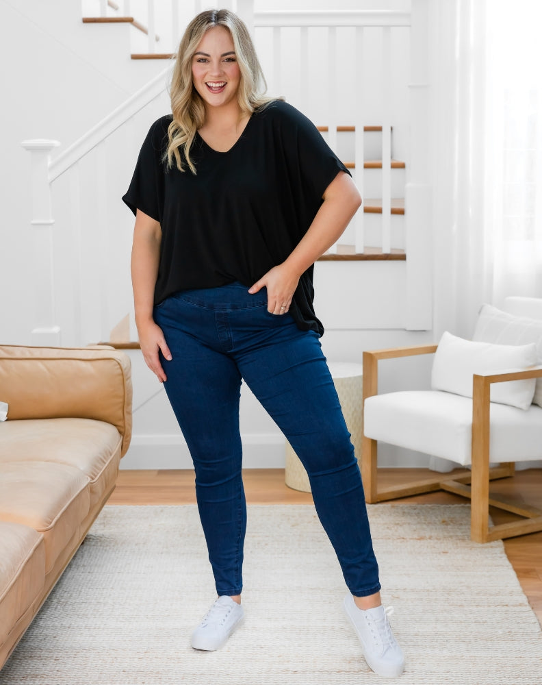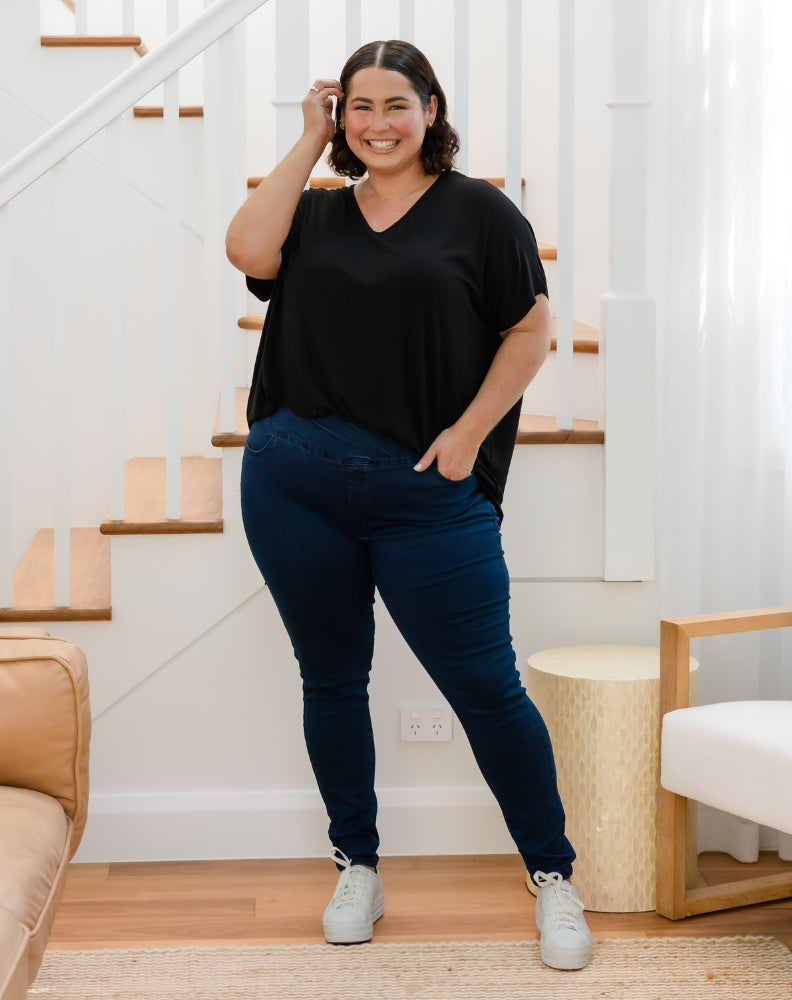 Slip On Jeans are all about comfort and quickly will become your new go-to jeans! A skinny leg fit with stretch, these jeans also have a banded elasticised waist. The black wash is timeless and easy to style for both day & night.