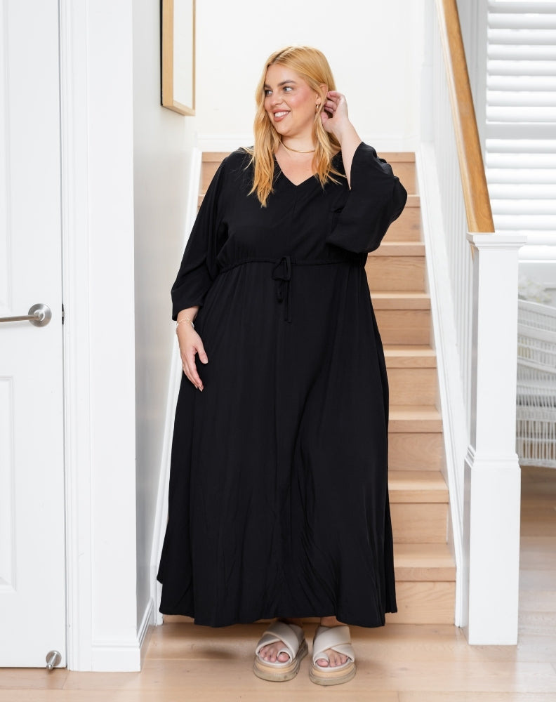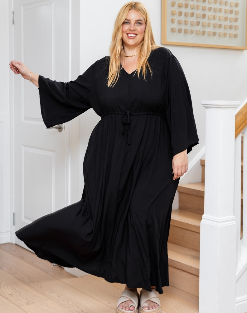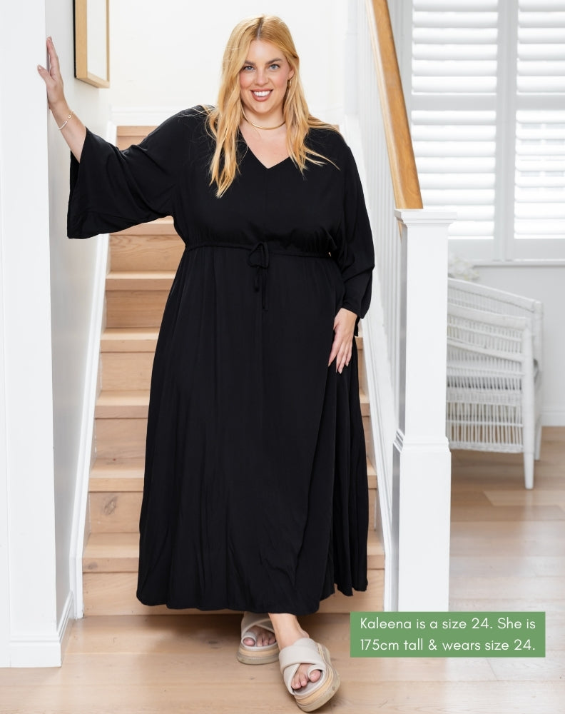 Our Zoe Maxi Dress is sure to attract many compliments!! Featuring statement wide sleeves, a drawstring tie to define the waist and a flowing skirt that skims over the hips. Style from casual to dressy with a simple change of accessories and shoes.